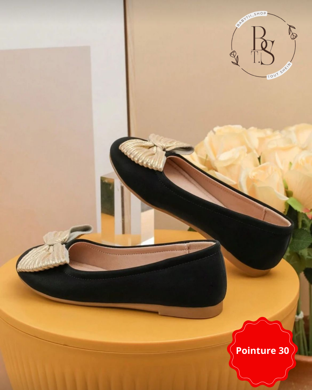 Apportez une touche chic et brillante au quotidien avec ces ballerines noires à nœud doré. Confortables et légères, elles s’adaptent aussi bien à un look décontracté qu’à une tenue habillée.