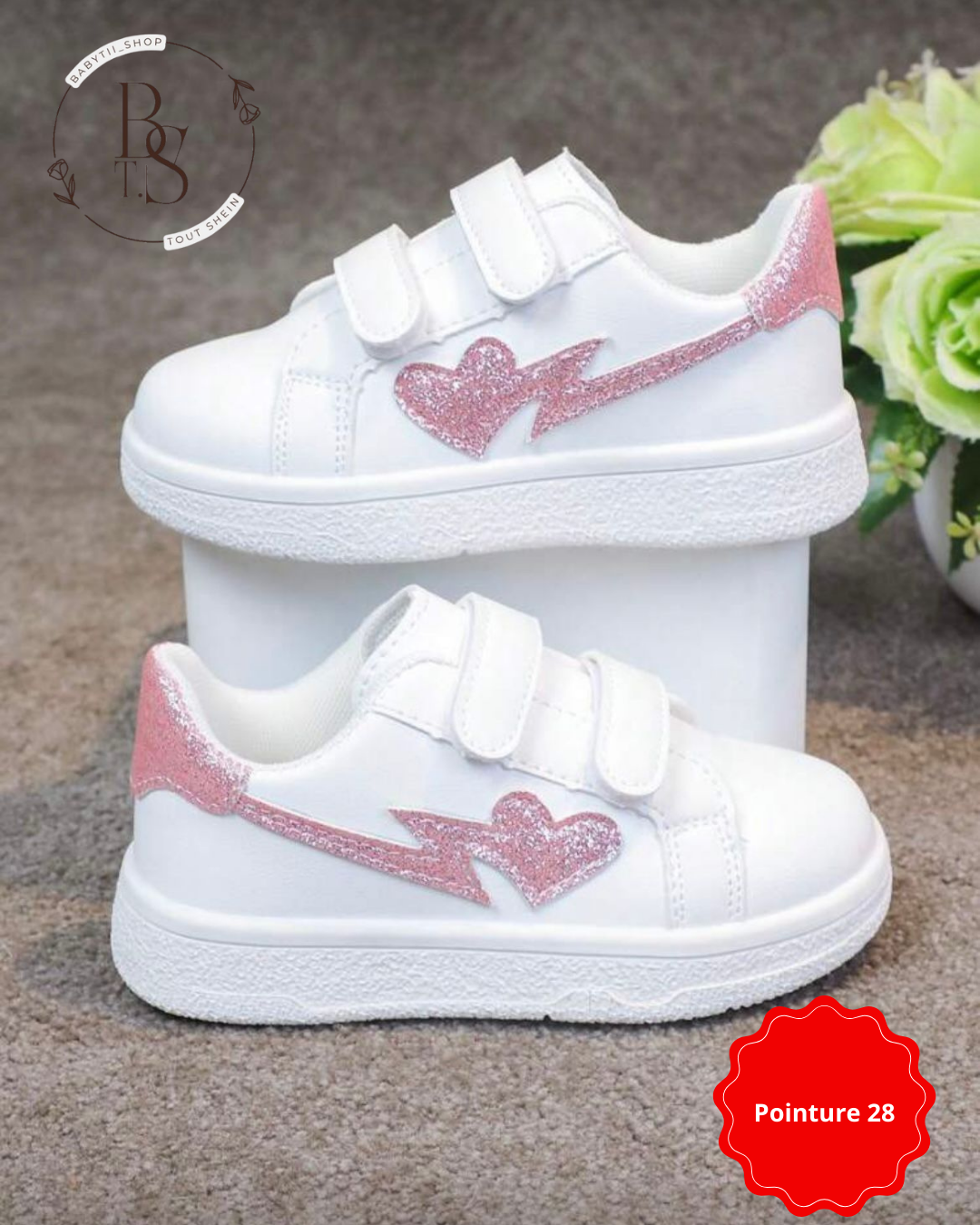 Baskets enfants pointure 28, blanches et respirantes avec décor cœur et papillon. Légères, confortables et parfaites pour l’école, le sport et le quotidien.