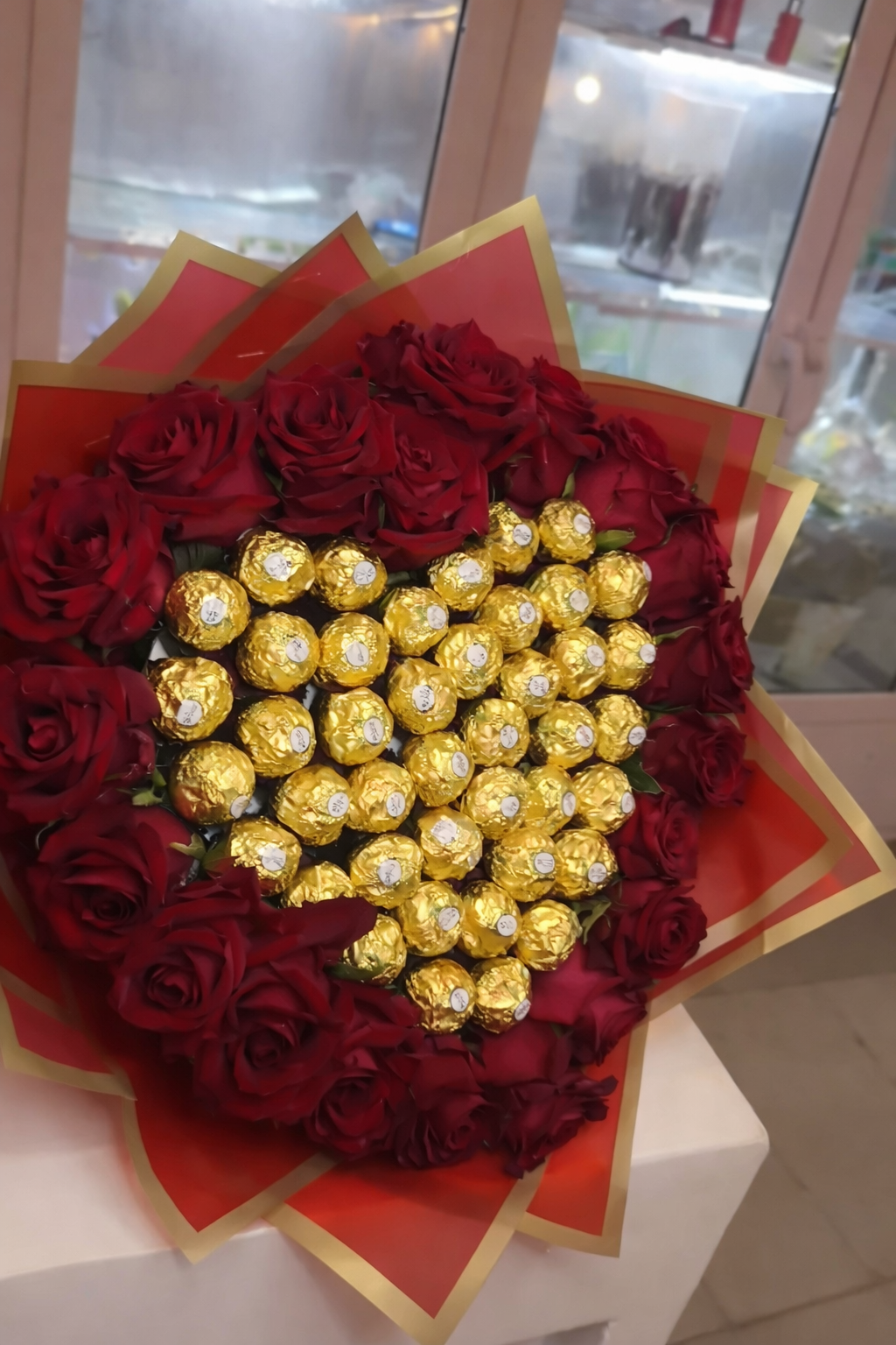Les roses rouges symbolisent l’amour intense, tandis que les Ferrero Rocher dorés apportent une touche de luxe et de plaisir irrésistible.