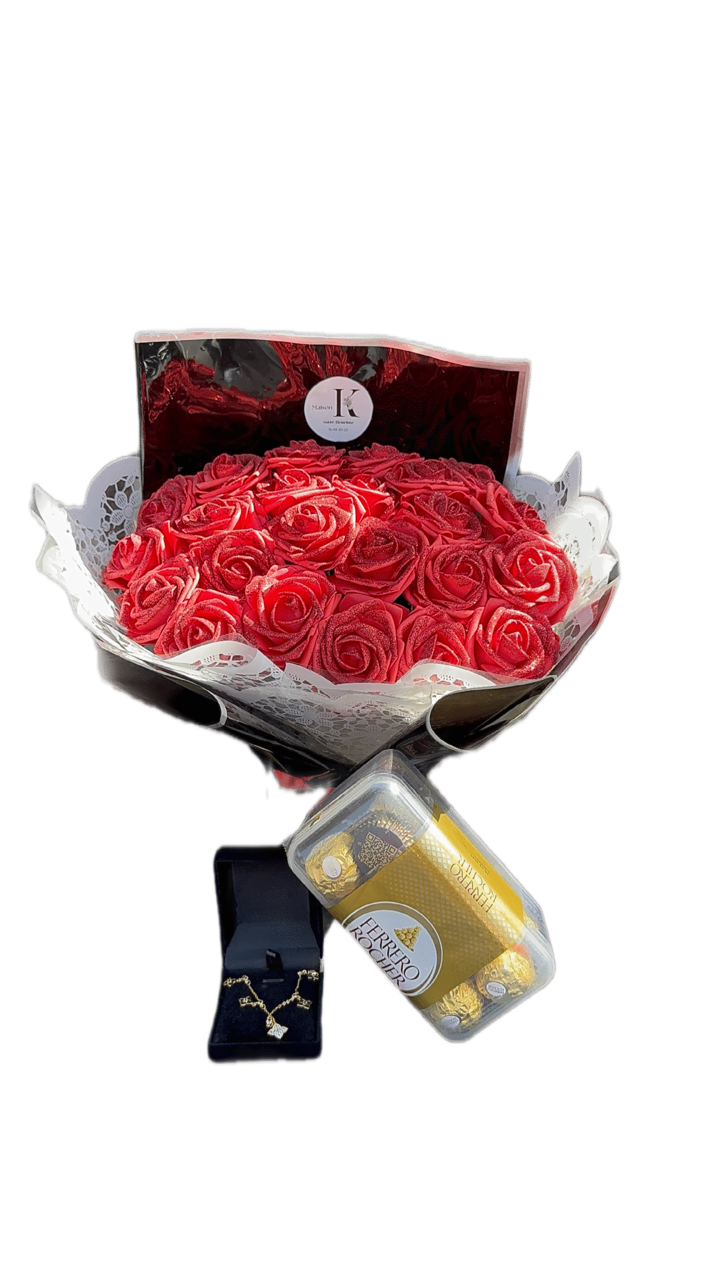 Entre la beauté d’un bouquet rouge, la gourmandise des chocolats et la délicatesse d’un collier, elle crée une surprise touchante et mémorable.