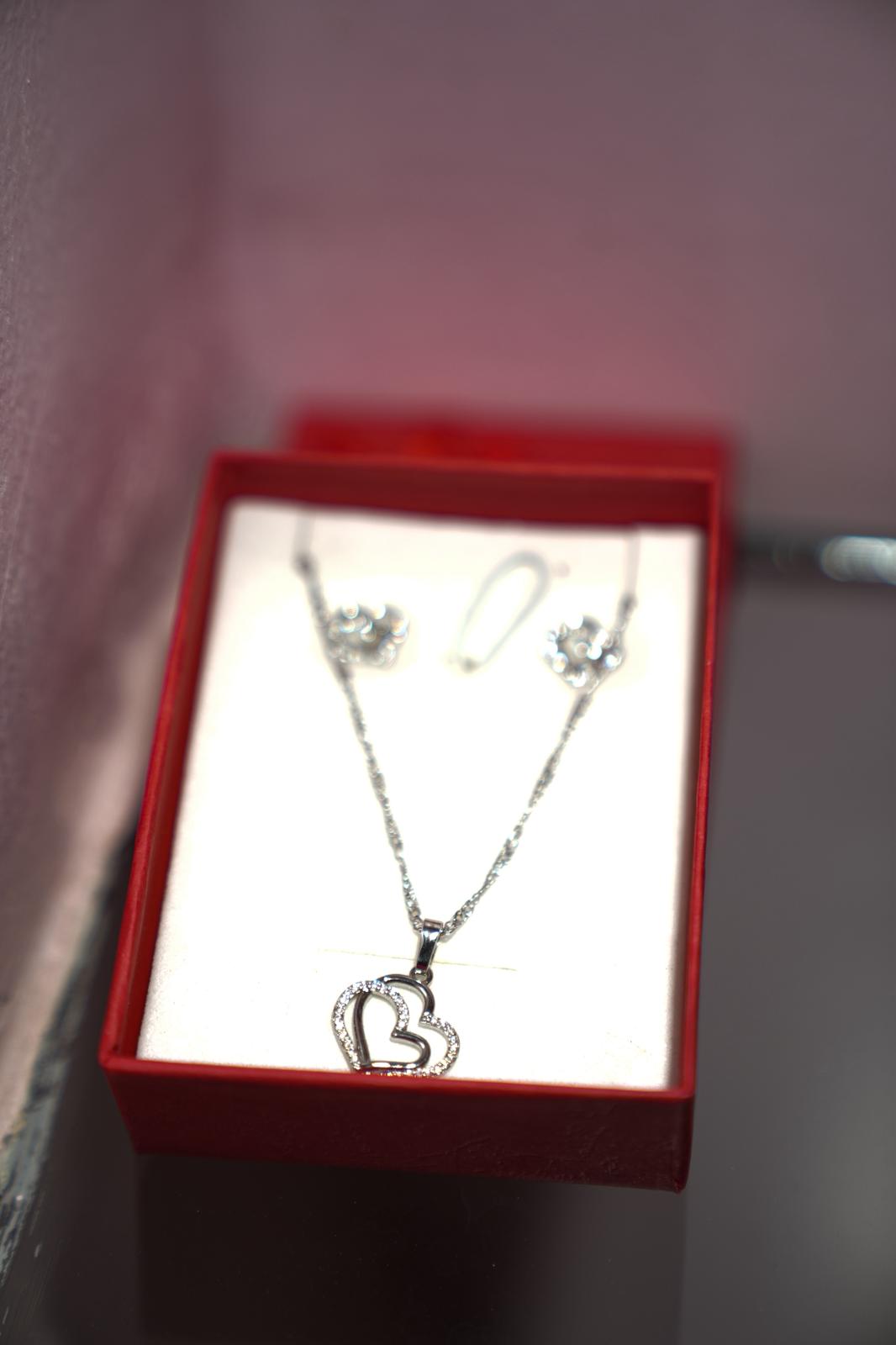 Son pendentif en forme de cœur, sublimé par des pierres brillantes, s’accompagne de boucles d’oreilles assorties pour un rendu harmonieux et raffiné.