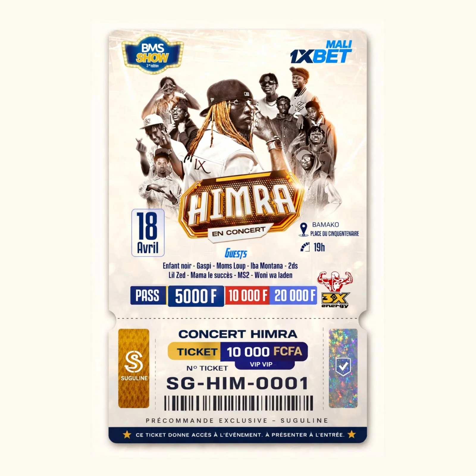 Ce ticket donne accès au concert de HIMRA qui se tiendra à Bamako le 18 avril à la Place du Cinquantenaire à partir de 19h.