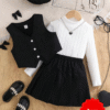 Ensemble fille 7 ans élégant et confortable : gilet noir à simple boutonnage, T-shirt blanc à manches longues col montant et mini-jupe noire plissée. Parfait pour école et sorties.
