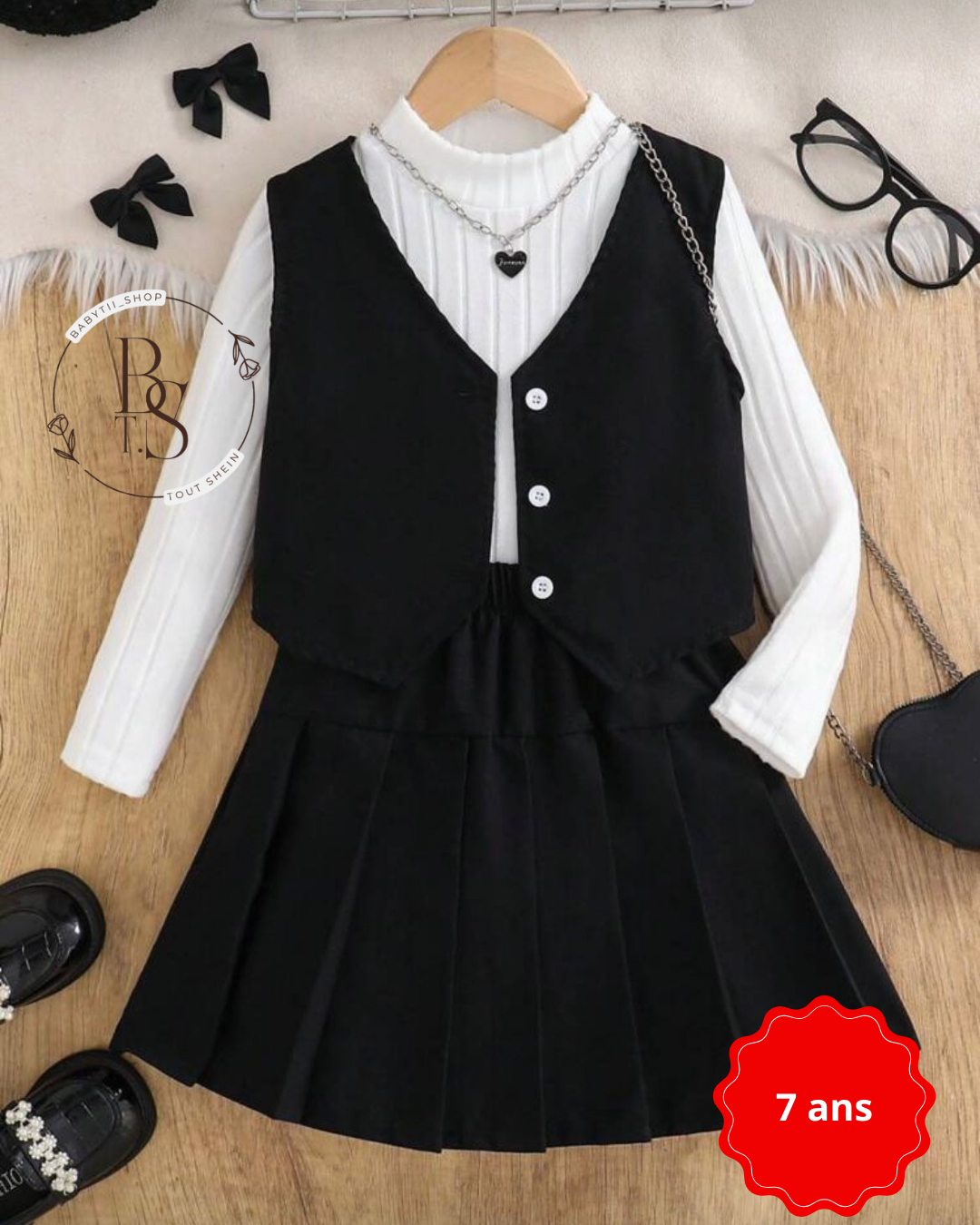 Cet ensemble fille 7 ans allie style et confort au quotidien. Il se compose d’un gilet noir à simple boutonnage, d’un T-shirt blanc à manches longues avec col montant et d’une mini-jupe plissée assortie. Chic et polyvalent, il convient pour l’école, les sorties et les occasions spéciales.