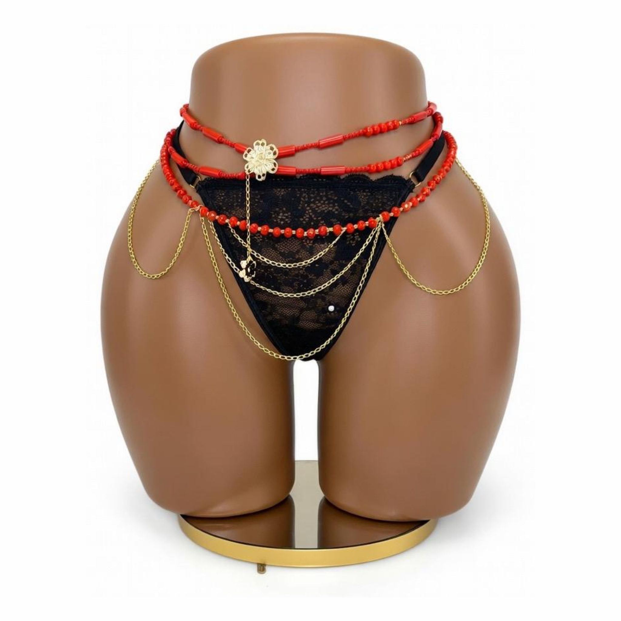 Ces bayas Feminity se distinguent par leurs perles rouges intenses associées à de délicates chaînes dorées, créant un équilibre parfait entre élégance et sensualité. Le design multicouche apporte du volume et met en valeur la taille avec finesse.