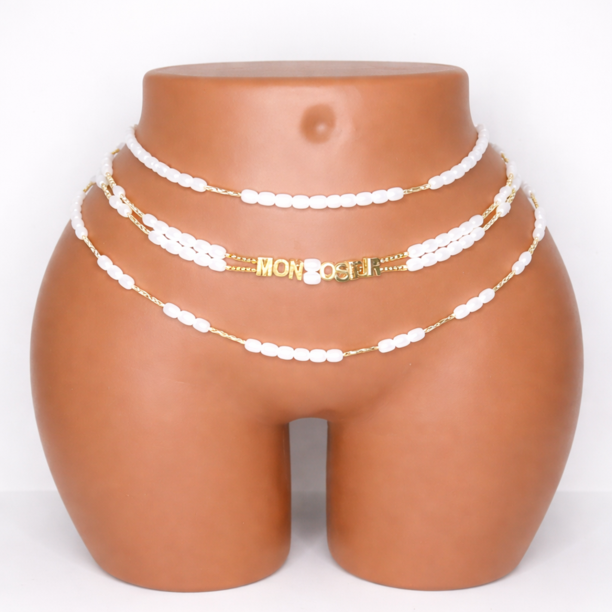 Ces bayas Feminity en perles blanches offrent un style pur, doux et élégant. Leur design multicouche met en valeur la taille avec finesse, tandis que le détail “Mon Chéri” en finition dorée apporte une touche romantique et unique.