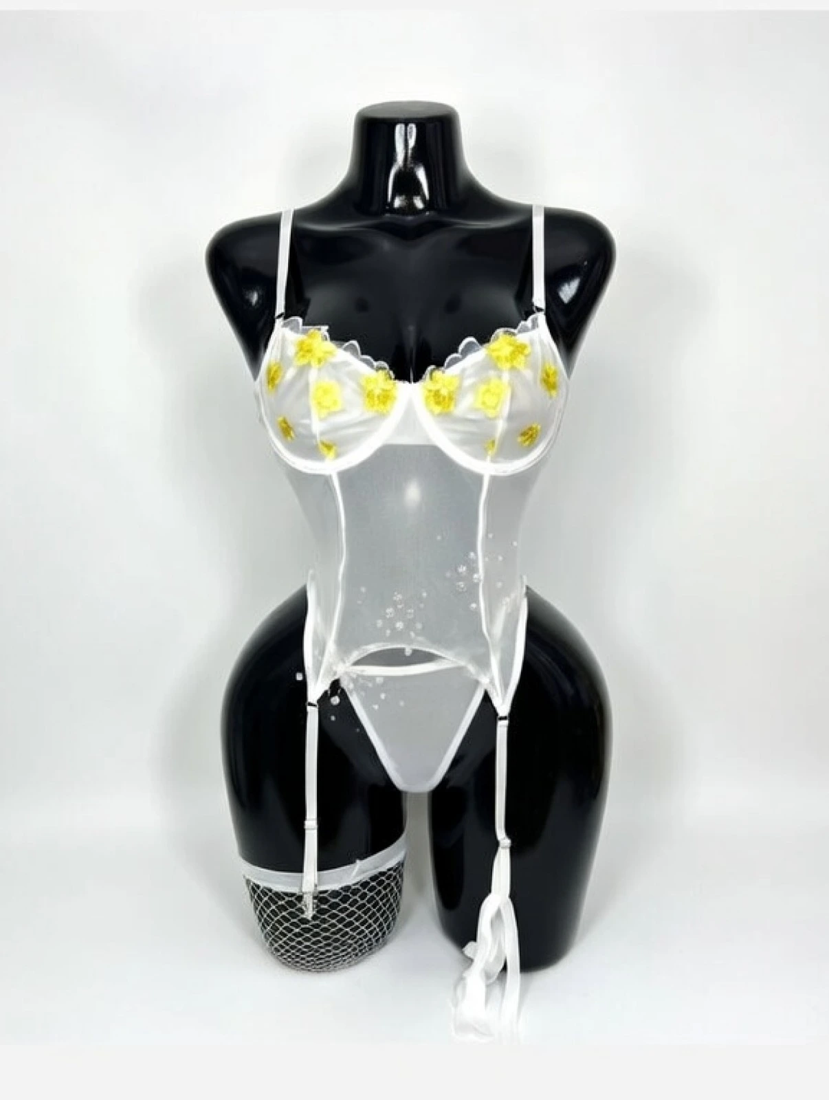 Feminity – Body Lingerie Blanc Transparent avec Fleurs Jaunes et Jarretelles 10 000 CFA