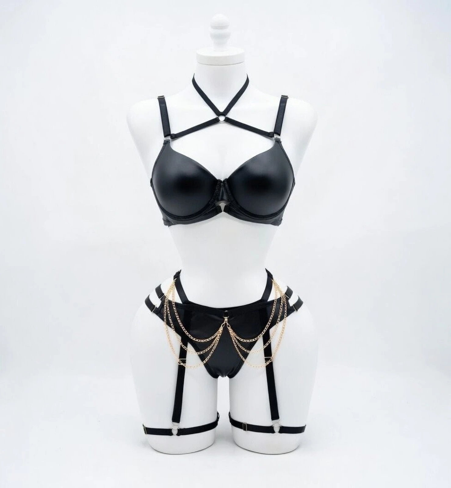 Cet ensemble lingerie Feminity incarne parfaitement l’élégance moderne et la sensualité affirmée. Composé d’un soutien-gorge structuré avec harnais au niveau du cou et d’un bas assorti, il est sublimé par de délicates chaînes dorées qui apportent une touche luxueuse et originale.