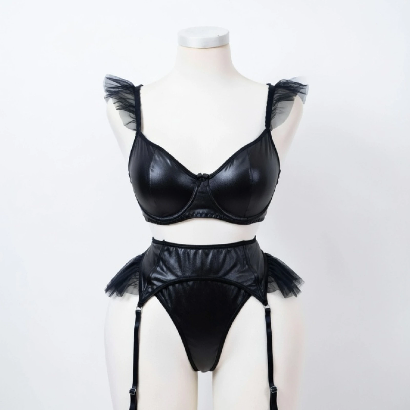 Feminity – Ensemble Lingerie Noir Brillant avec Volants et Jarretelles 10 000 CFA