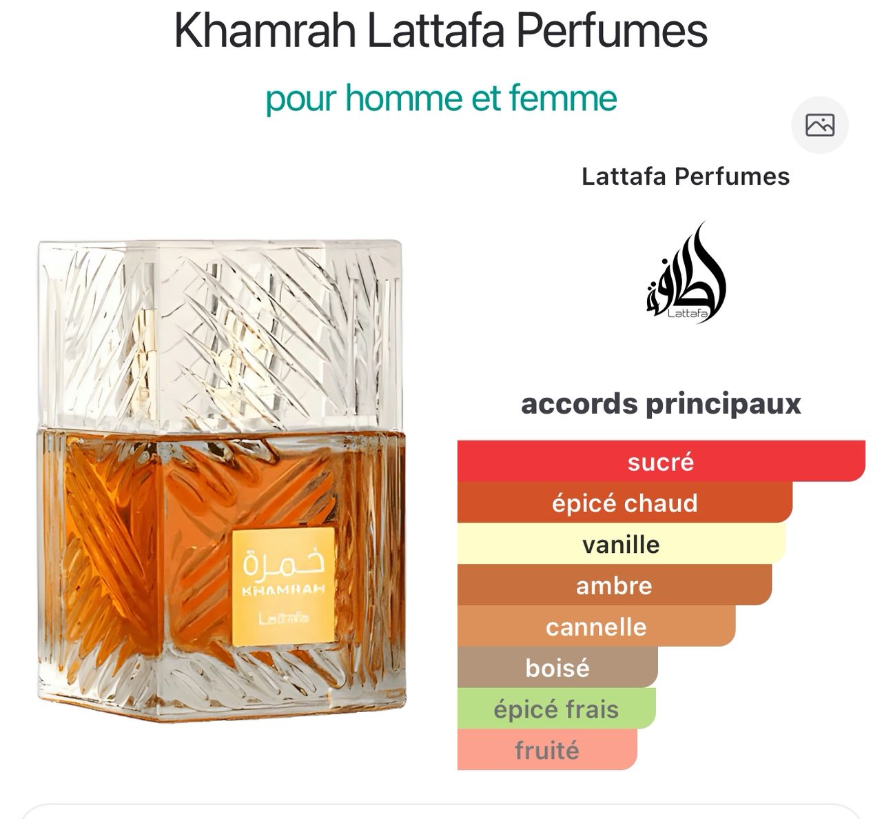 Khamrah Eau de Parfum de Lattafa Perfumes est une fragrance orientale gourmande qui séduit par son intensité et son élégance.