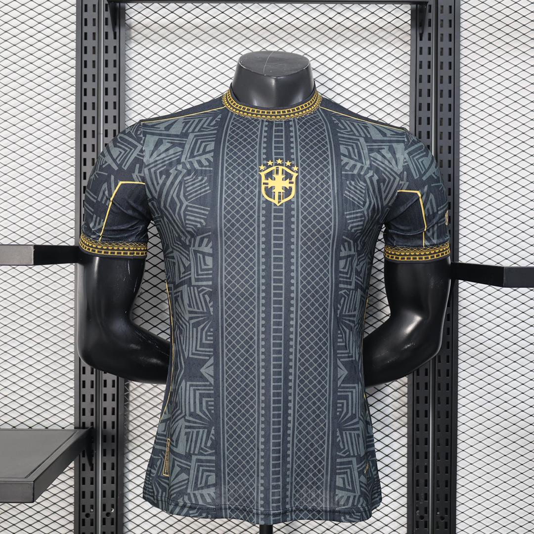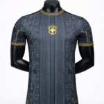 Le Maillot Brésil Noir & Or 25/26 – Édition Spéciale se distingue par son design sombre rehaussé de finitions dorées élégantes.