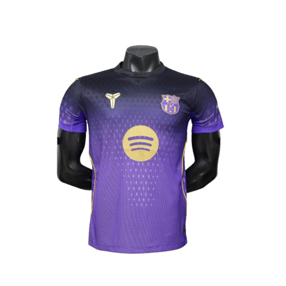 Ce maillot de football s’inspire du style du FC Barcelone avec une touche moderne en violet et or.