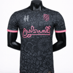 Le Maillot Palestine Gris & Rose 25/26 combine sobriété et modernité grâce à son fond gris foncé travaillé avec un motif floral intégral et des finitions rose vif.