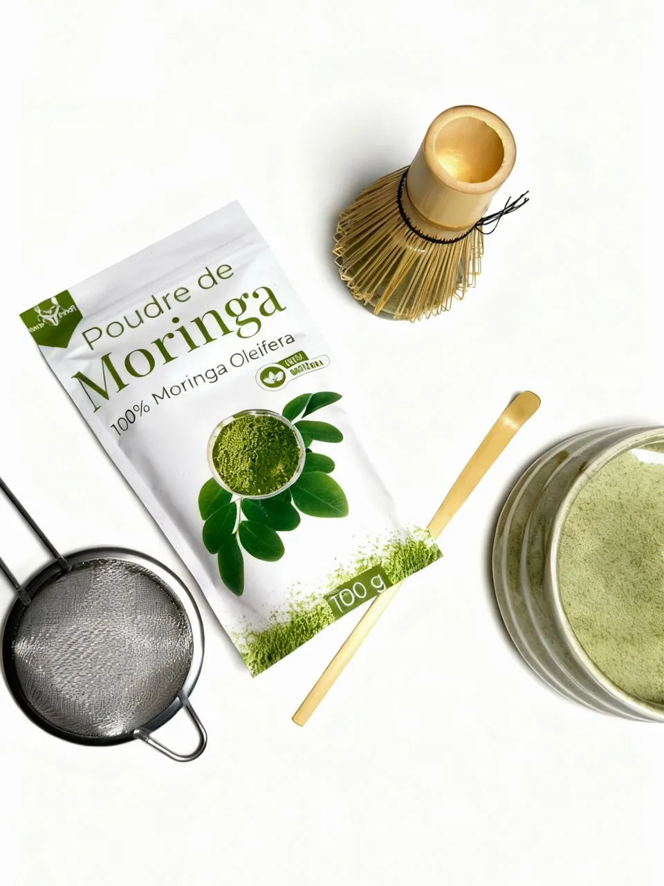 Véritable trésor nutritionnel africain, le moringa est reconnu pour sa richesse exceptionnelle en vitamines, minéraux, protéines végétales et antioxydants. Il s’intègre facilement dans l’alimentation quotidienne (eau, jus, smoothies, sauces, bouillies).