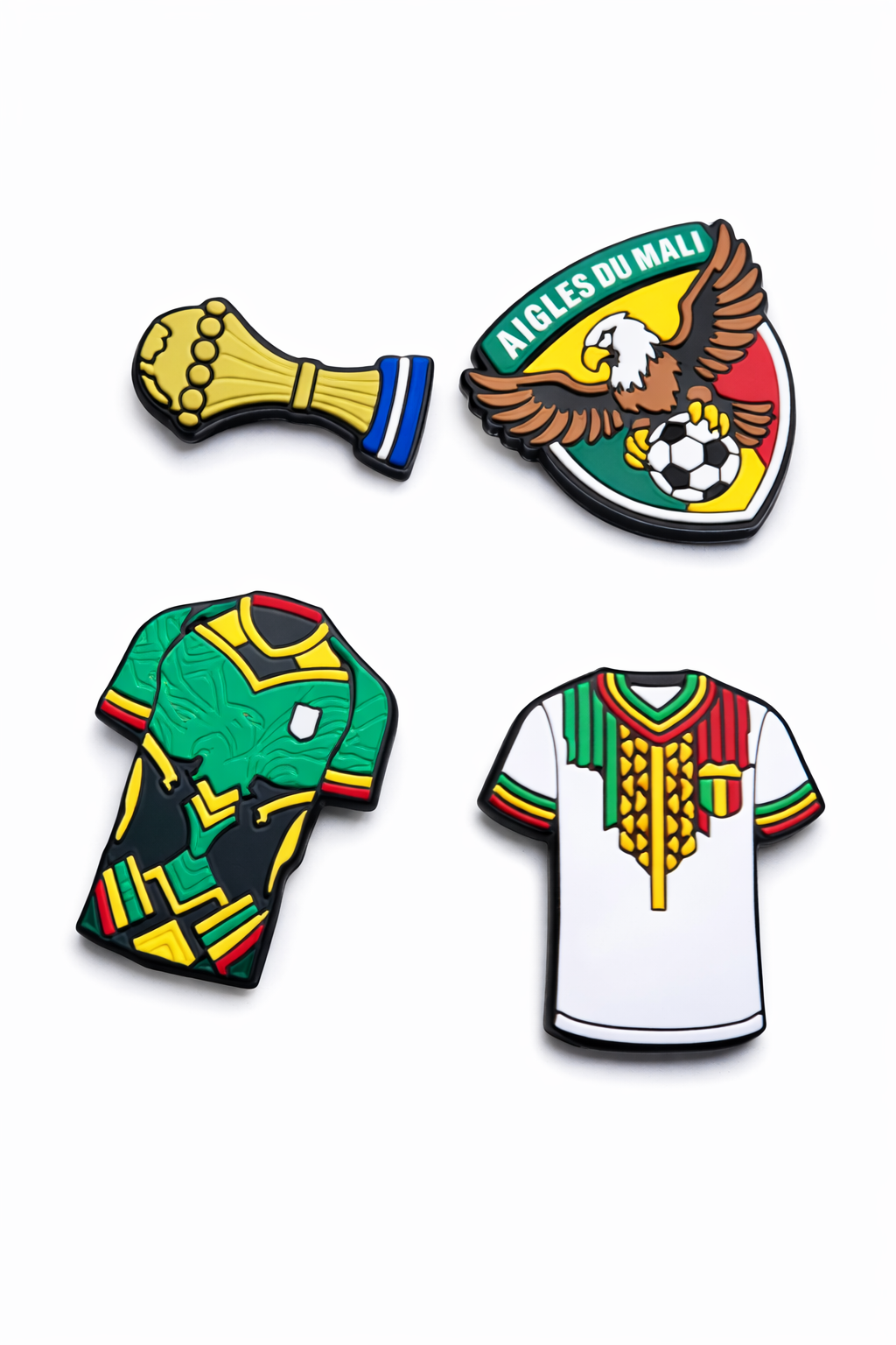Inspirés du football malien, ils représentent les maillots emblématiques, le logo des Aigles du Mali et des symboles forts qui parlent à tous les fans. Leur matière résistante garantit une excellente tenue au quotidien, même face à l’eau et aux mouvements.