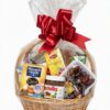 Le Panier Gourmand Ramadan est soigneusement présenté dans un joli panier décoré avec un emballage transparent et un nœud élégant, idéal à offrir ou à partager en famille.