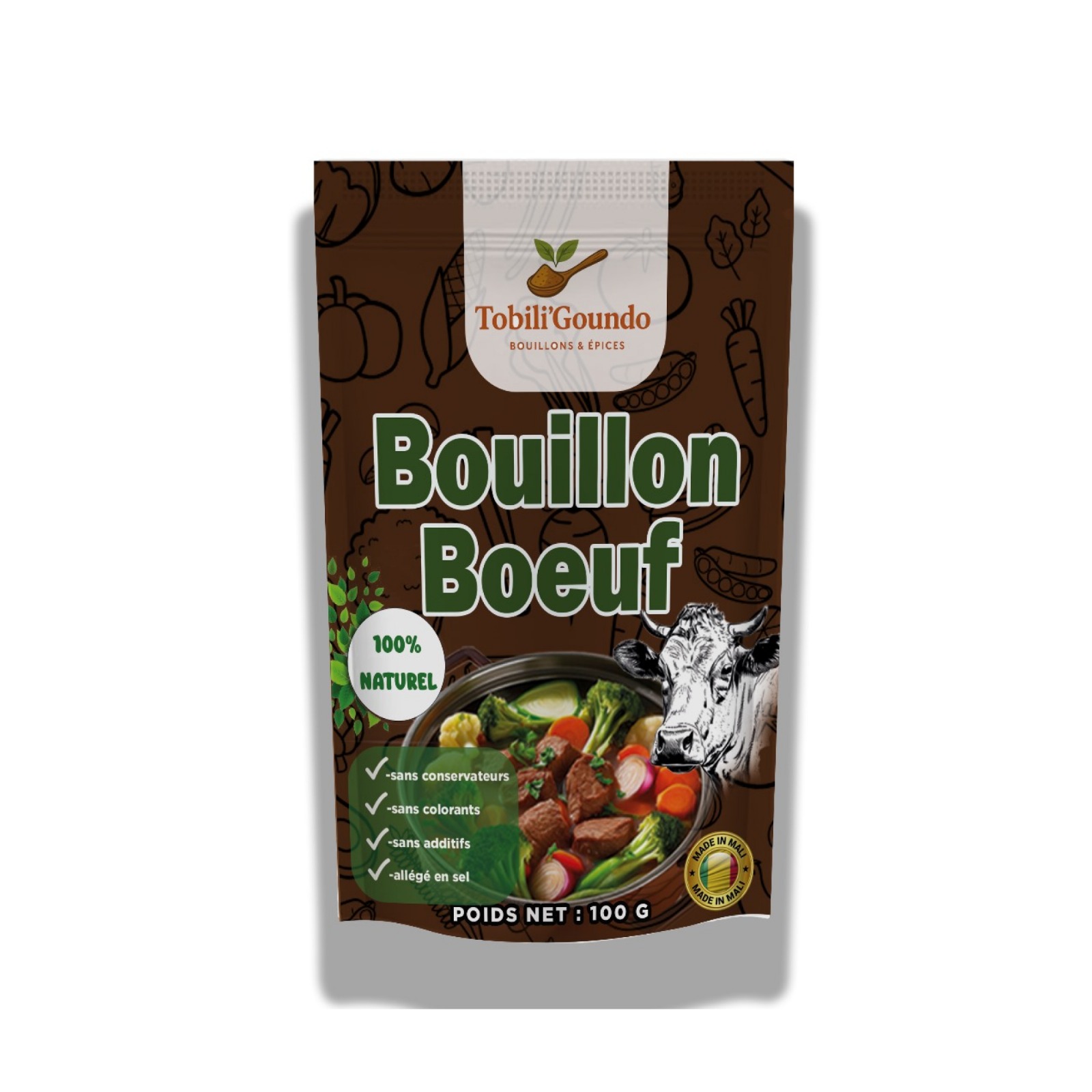 Le Bouillon Bœuf Naturel Tobili’Goundo est un assaisonnement artisanal fabriqué au Mali à partir d’ingrédients naturels.
