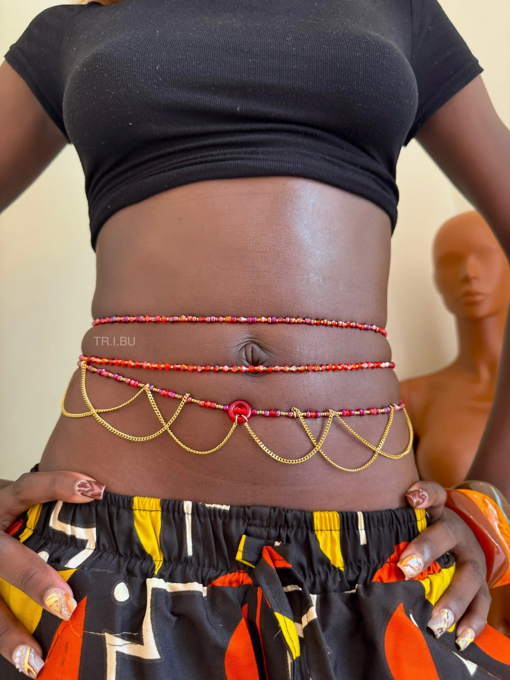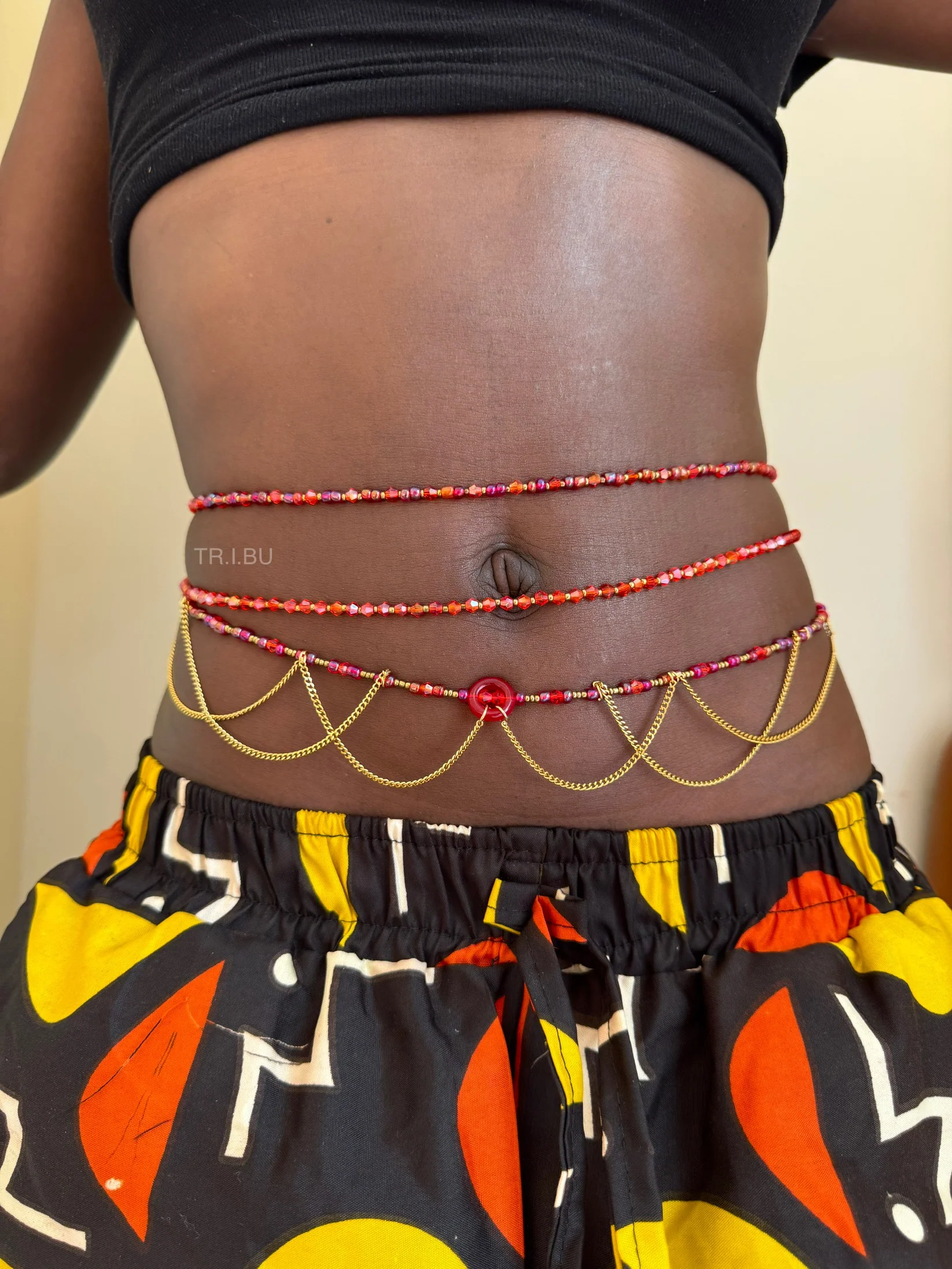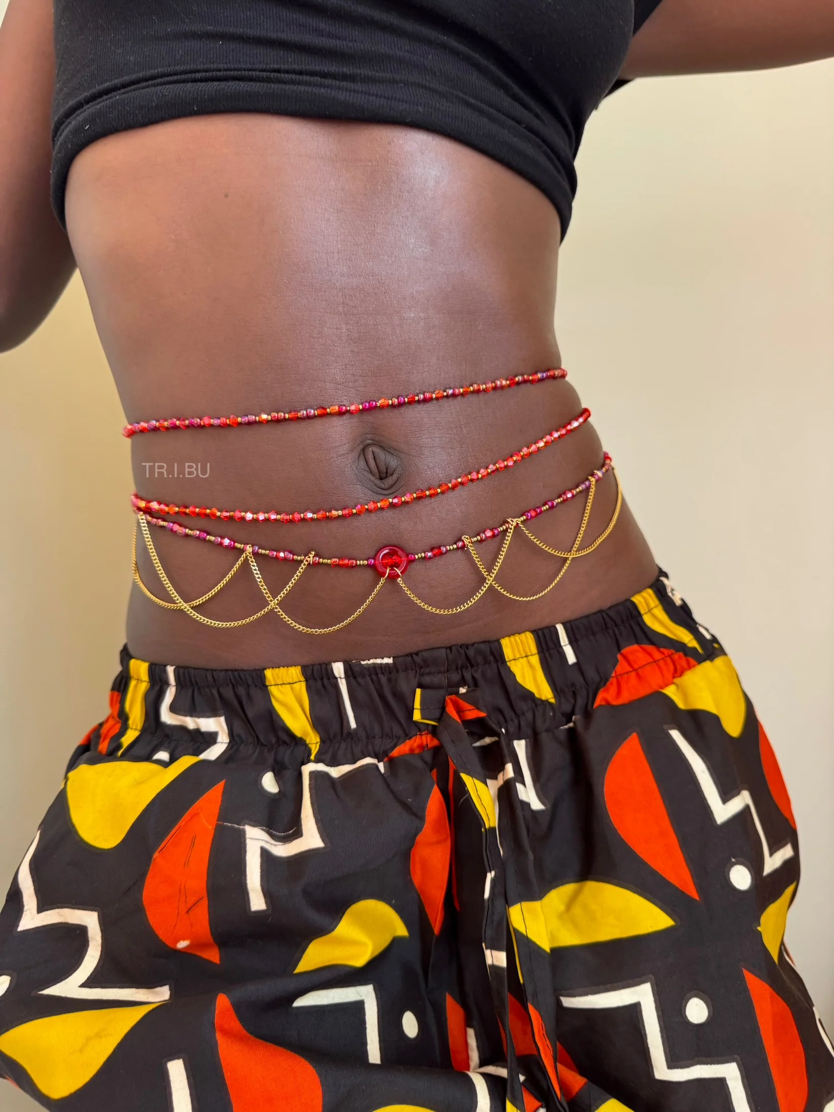 Le pendentif central rouge attire le regard et s’accompagne de délicates chaînes dorées qui retombent élégamment sur la taille, créant un effet bijou sophistiqué et original. Cette combinaison de perles colorées et de détails dorés apporte une touche à la fois moderne, audacieuse et raffinée.