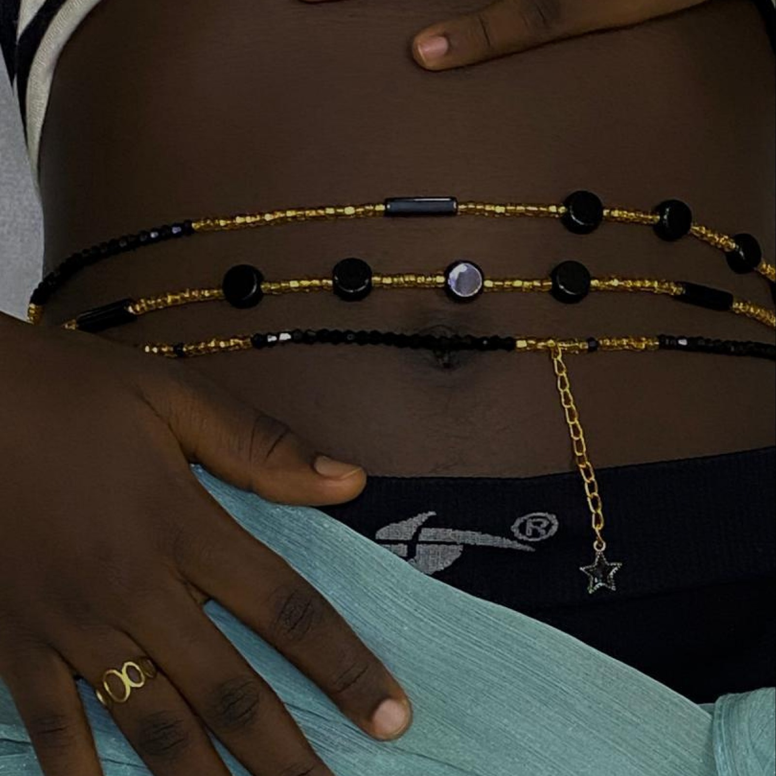 L’Ensemble Crépuscule de Tuska est une chaîne de taille raffinée composée de trois rangs mêlant perles noires et dorées pour un contraste luxueux. Conçu sur un fil élastique résistant, il s’adapte naturellement à la morphologie afin d’offrir un maintien agréable toute la journée. Les formes variées des perles et la présence d’un pendentif discret ajoutent une touche d’originalité tout en conservant une allure chic. Idéal pour sublimer la taille avec élégance, ce bijou s’accorde parfaitement aux styles modernes comme traditionnels.