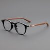 Lunettes de vue légères avec monture transparente et branches effet bois naturel.